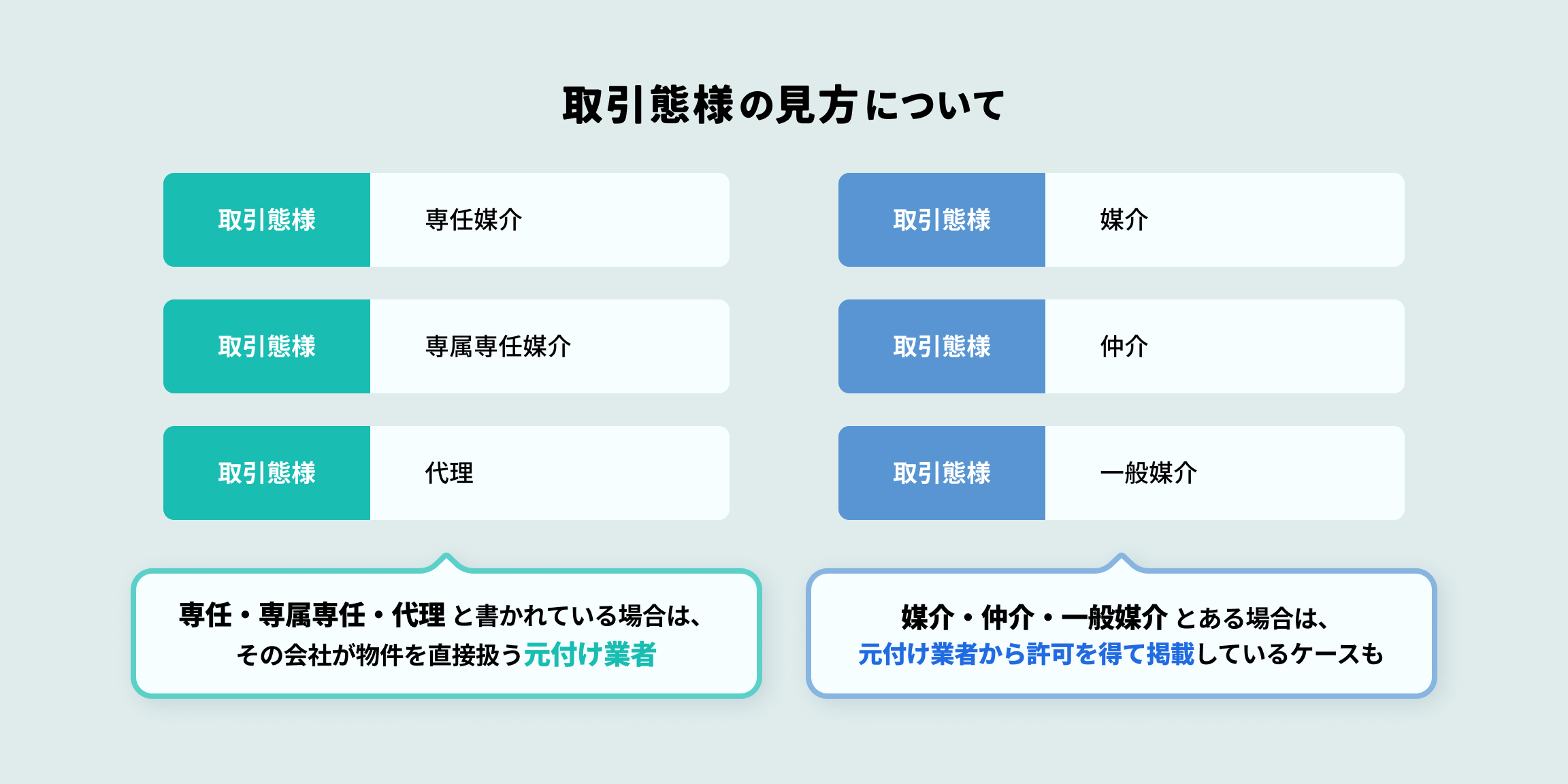 - 元付け業者かどうかの判断方法:物件詳細ページの「取引態様」欄で確認可能